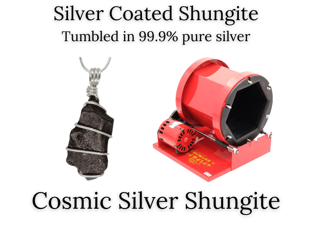 To create Cosmic Silver Shungite, we begin with carefully selected pieces of Shungite, then place them in our hexagon-shaped rock tumbler, tumbling them in 99.9% pure silver for (3) days. This process ensures thorough coverage of the Shungiteโs surface with a thin layer of silver particles.
