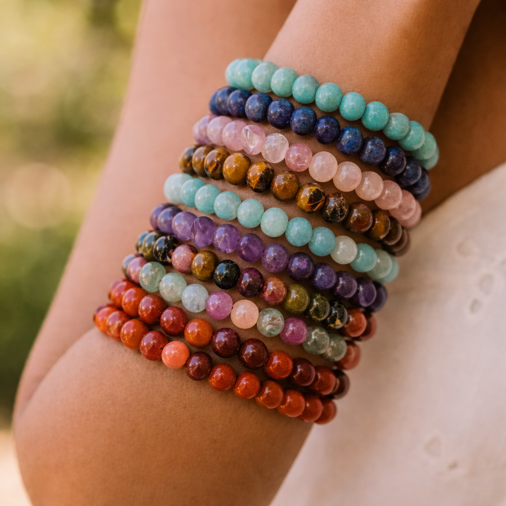 This collection is all about real stone, real craftsmanship, and real durability. Each bracelet is made with smooth, polished 8mm natural rock and crystal beads, carefully selected for beauty, consistency, and energy. No mass production here—every bracelet is hand-strung by us, one at a time.