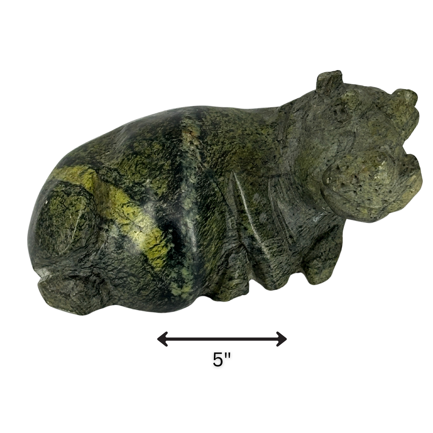 Don’t let the size fool you—this hippo has weight and attitude. Carved from solid natural Lizardite, this piece measures 5 inches long and weighs approximately 1.1 lb, giving it a compact but powerful presence. It feels grounded in the hand, not decorative or hollow.